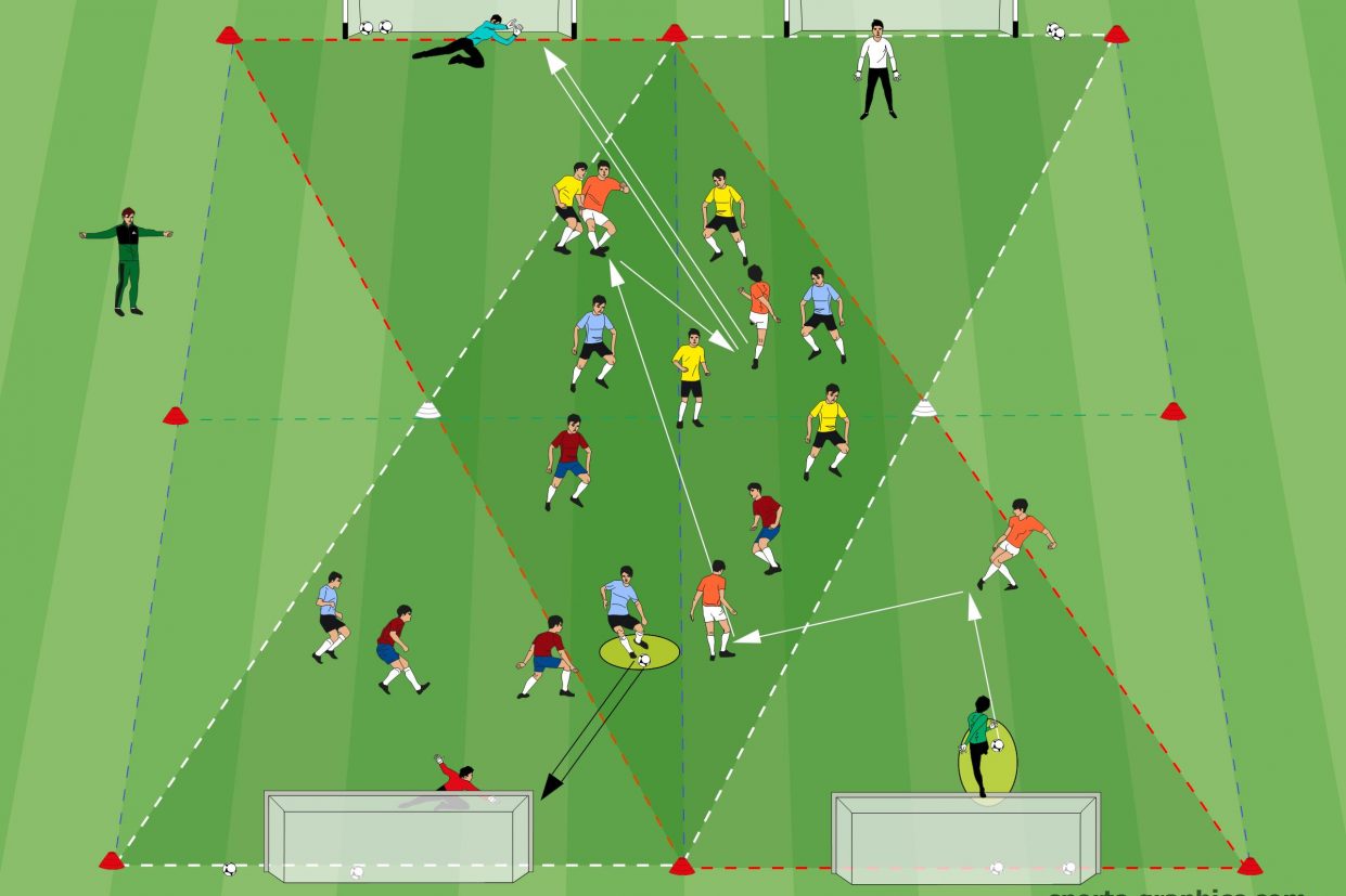 In the first drill, teams defend one goal in either a vertical or diagonal 4 vs 4 setup, promoting constant combination play and challenging players to adapt to varying patterns and finishes. The direction of play changes after each successful finish, keeping the game dynamic and players on their toes.