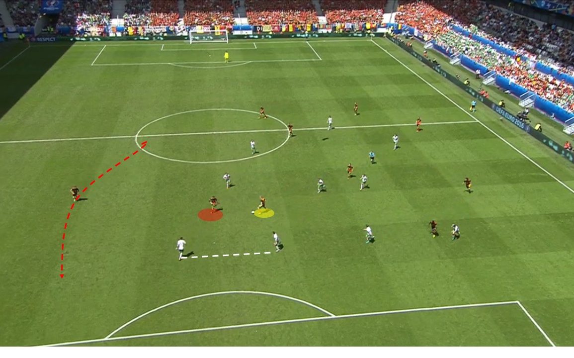 Example: Hazard has the ball. Belgium has not occupied a vertical passing option. There is no reason for Ward (Irish left-back) not to defend wider. This safety distance he holds a long. The ball is put back to the penalty area and also no pressure is put on the player in possession. Axel Witsel scored after the cross and decides the game.