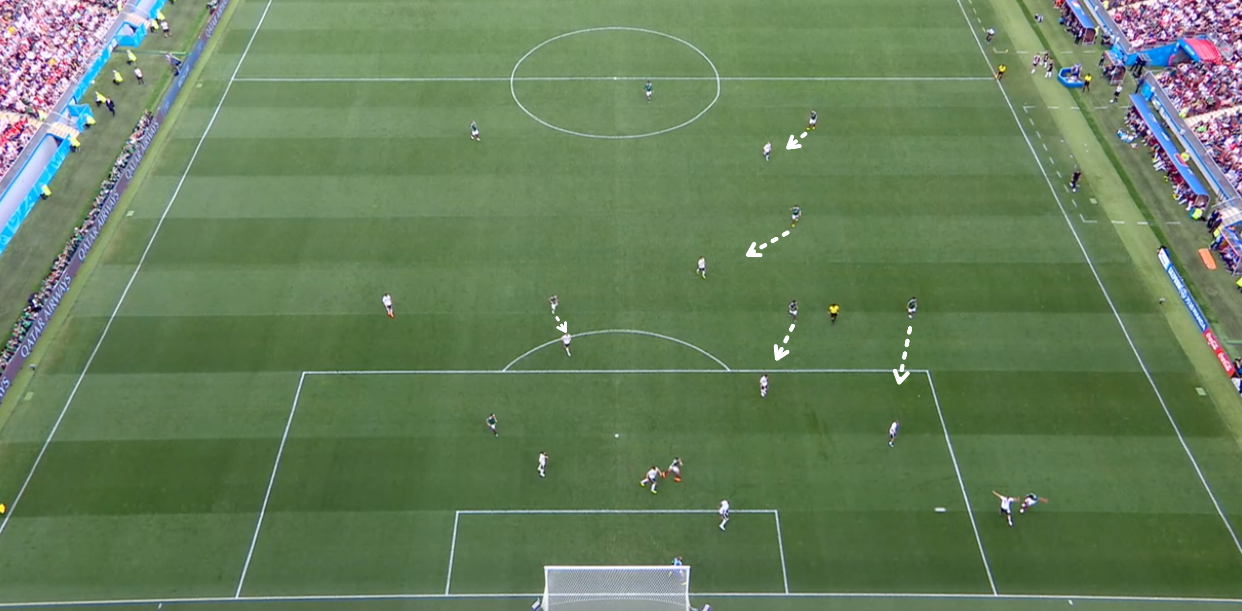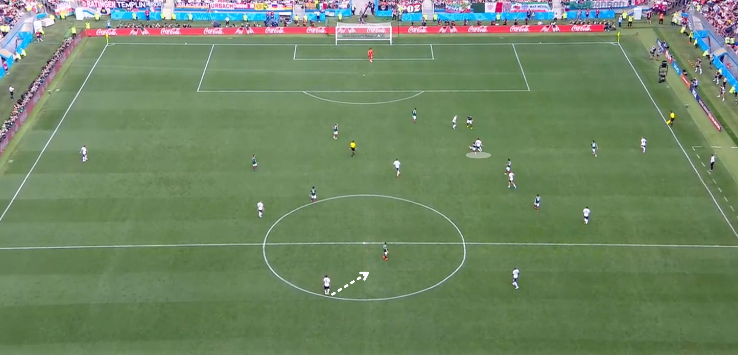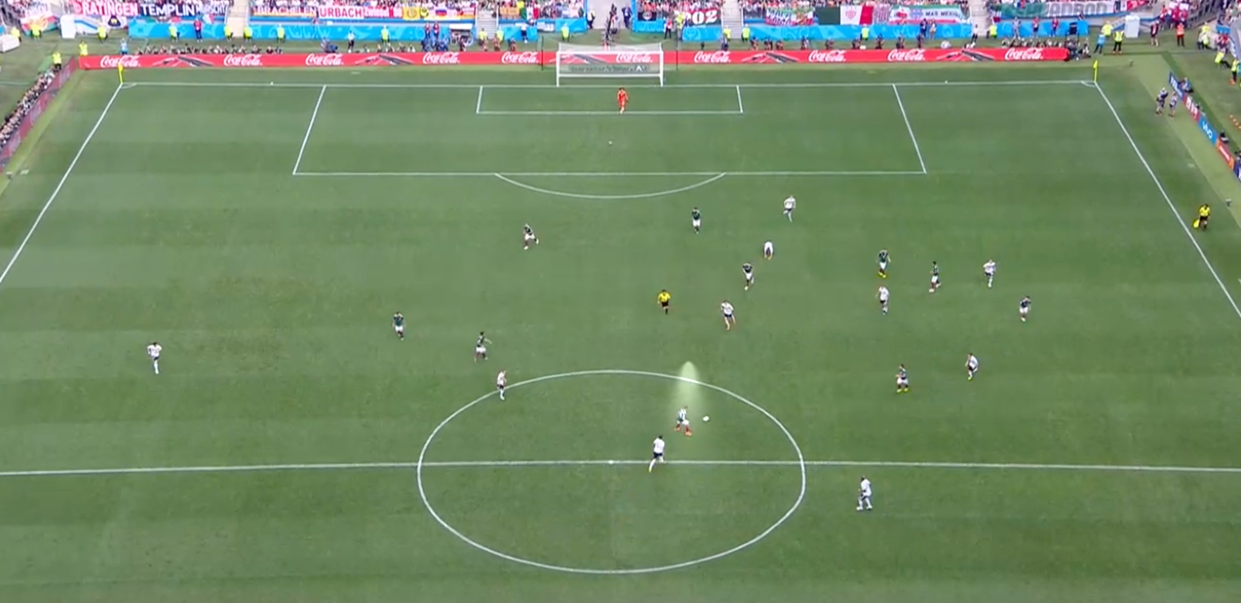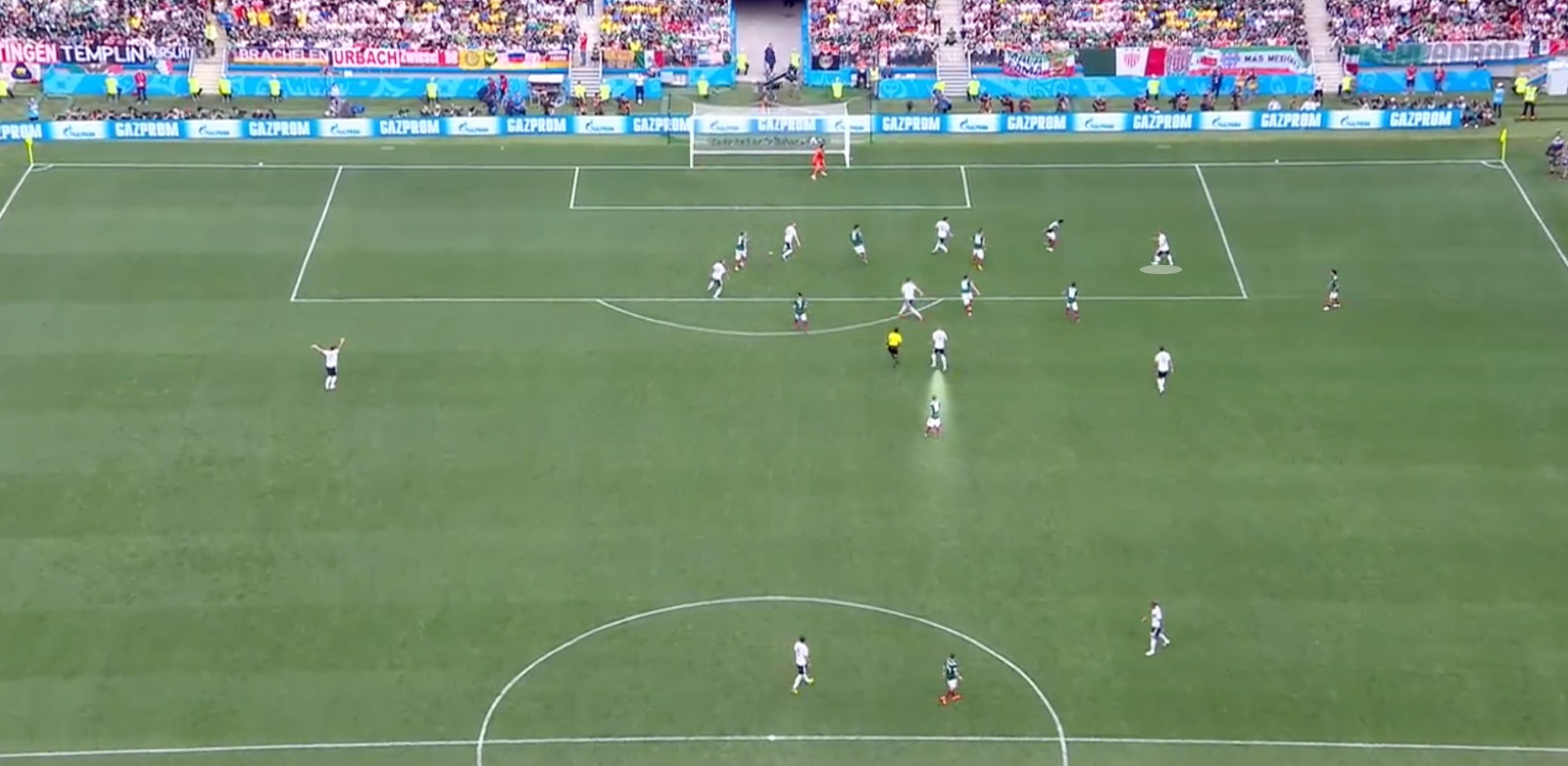 Mexico was better in the first half – in many ways. In addition to tactical variability (switching between high pressing and low block defending), they also showed more consistency in most situations. While Mexico was in possession of the ball they consistently secured the rest of the field – which was Germanys biggest problem throughout the entire game.