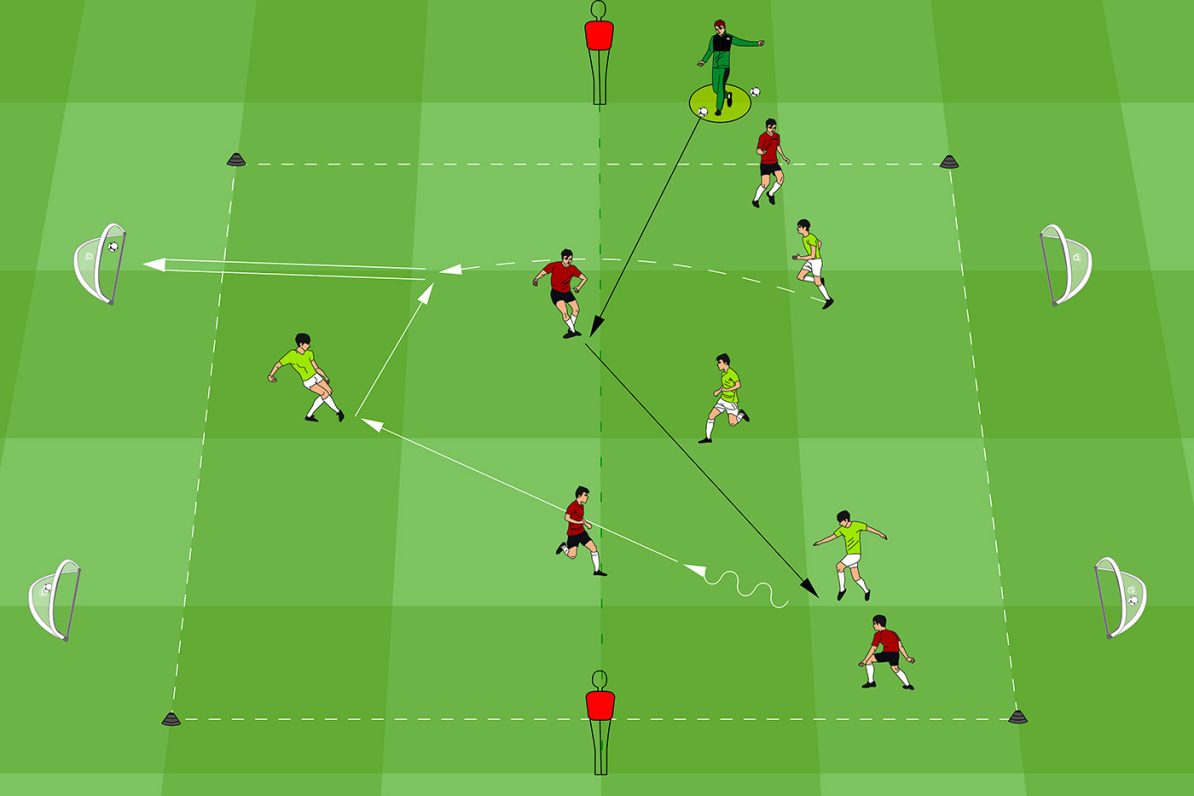 The exercise starts with a pass from the coach into a central attacking player. The attacking team attempts to score in a 4v3 situation on two mini goals.